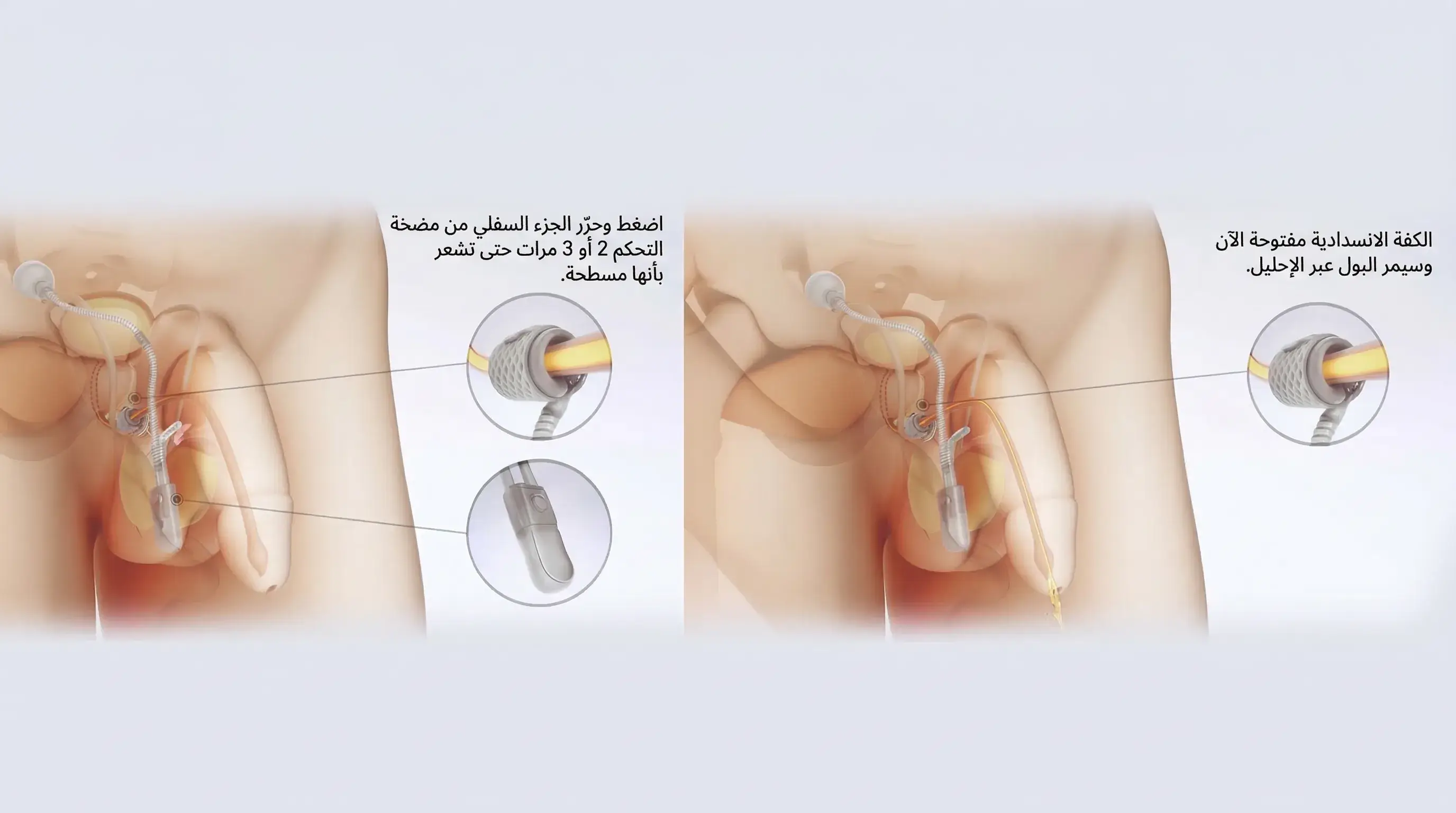 عندما تحتاج للتبول، تضغط على المضخة الموجودة في كيس الصفن عدة مرات. ينقل هذا السائل من الكُفّة إلى البالون، مما يفتح الإحليل.